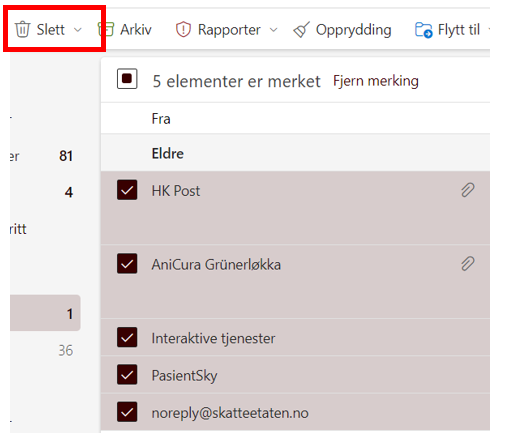Marker e-poster som du ikke lenger har behov for å ta vare på, for deretter å velge slett. Markere e-poster gjør du ved å klikke i den lille firkantede boksen foran avsenderadressen. Er det flere e-poster etter hverandre som skal slettes kan du ved hjelp av Shift tasten markere e-poster som står etter hverandre.