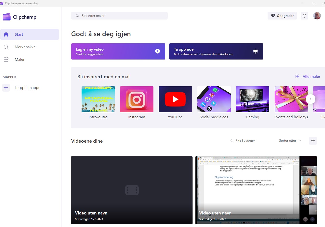 På toppen ser du valgene “Lag en ny video” og “Ta opp noe”. Det er bare å velge det du vil og følge veiviseren.