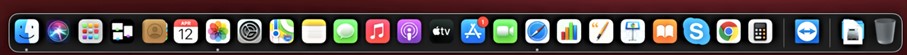 Dock vises nederst på skjermen på din Mac. Den viser programmer (apper) du enkelt kan åpne med et klikk. Dock viser en god del standard programmer, i tillegg til de programmer du selv kan velge å legge til der. Du kan kjenne igjen på Dock, hvilke programmer som er aktiv (åpen)  ved at de vises med en liten prikk under programikonet. I eksemplet er det Finder, Bilder og Safari.