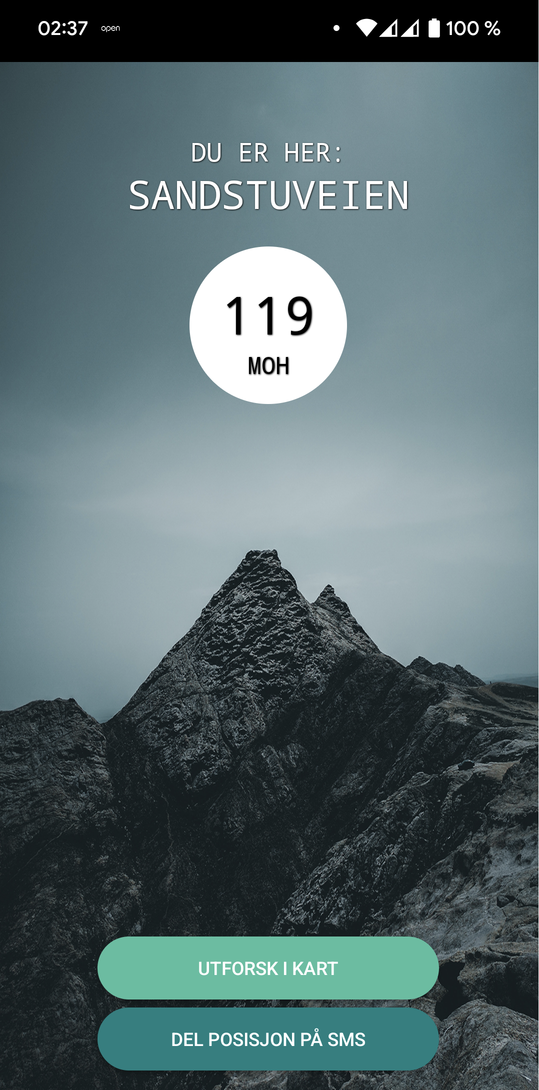 Når du åpner appen for bruk vil den vise hvor du er og hvor høyt over havet du befinner deg: