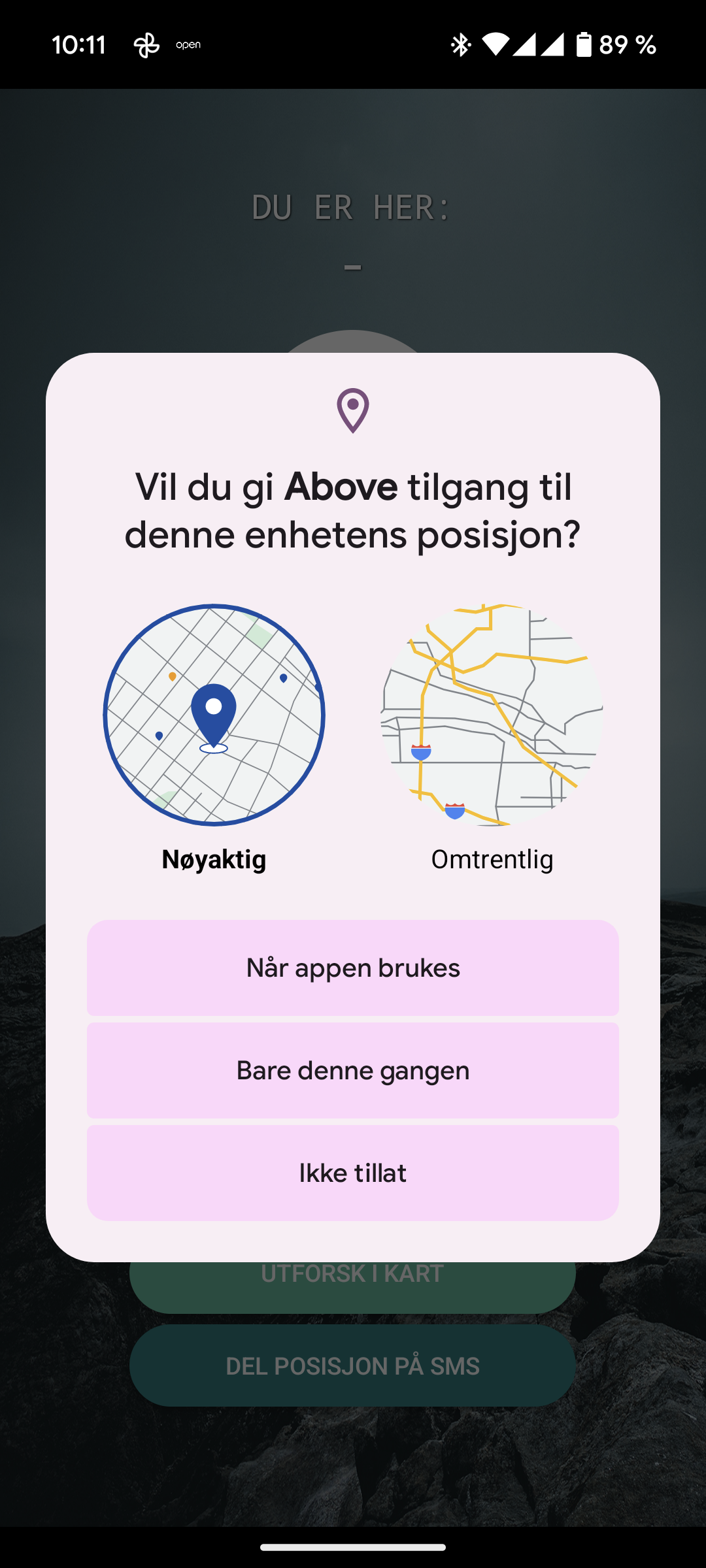Her bør du svare (trykke på) “Når appen brukes”. Da vil den virke hver gang og den vil ikke spørre om dette mer.