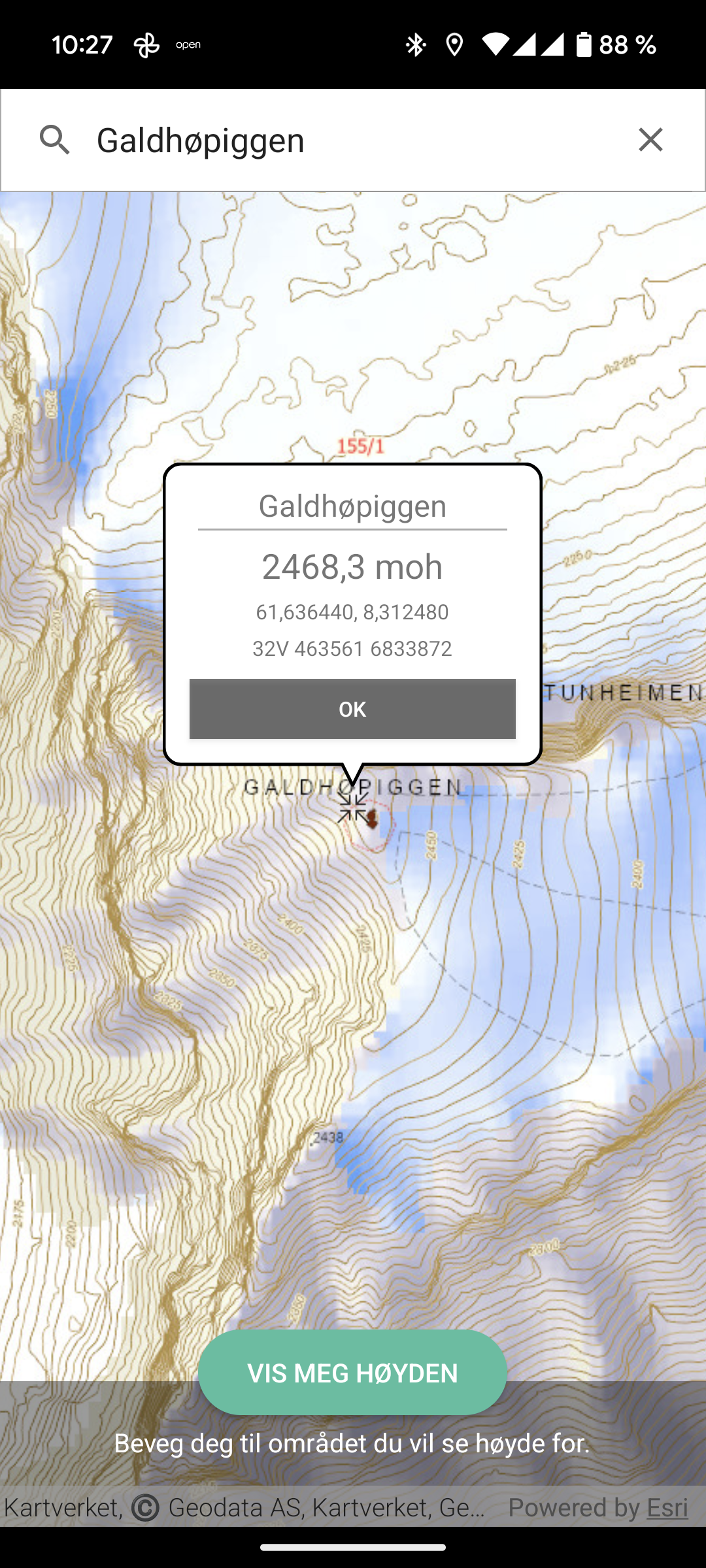 For moro skyld søkte jeg opp Galdhøpiggen (satt markør i Søke etter steder) i søkefeltet og trykket så Vis meg høyden:
