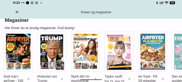 Vil du lese en av avisene eller magasinene? Trykk på den og den lastes ned til ditt nettbrett/telefon.
