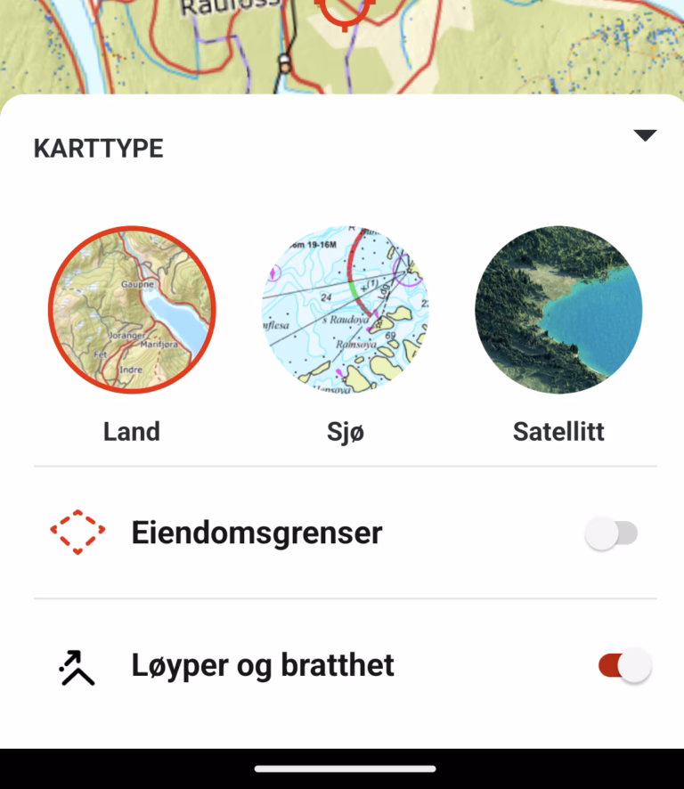 Ved å trykke på «karttype»-knappen kan du velge å vise sjøkart. Kjekt hvis du er på sjøen og mangler kartplotter.