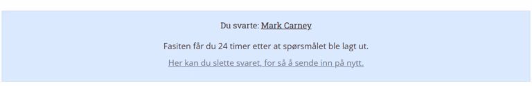 Jeg tror svaret er Mark Carney, så jeg skrev det der det står Skriv inn svaret ditt og jeg trykket på knappen Send inn svar.