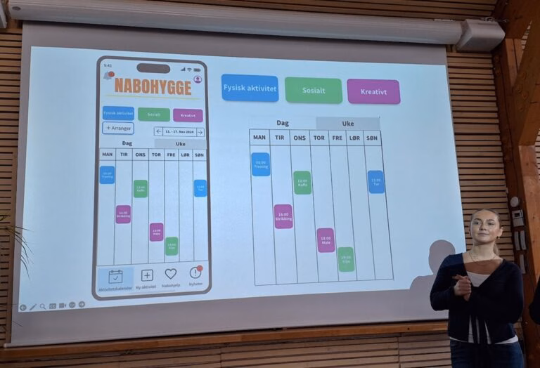 Fem studenter fra Folkehelse-studiet på Høgskolen på Vestlandet har i samarbeid laget en aktivitets-app for seniorer som en del av studiet siste studieåret. Tirsdag 5.november presenterte de appen for oss og viste hvordan man kan legge ut ulike aktiviteter, melde seg på og av og se hvem som har meldt seg på. Initiativene skal komme fra naboene selv. Man kan ha en knapp for å be om hjelp til ulike tjenester eller tilby hjelp av ulikt slag. Studentene ønsker å bruke oss på Helgetun som forsøkspersoner før de endelig lanserer appen. De fikk mange gode tilbakemeldinger fra oss i seniornett.