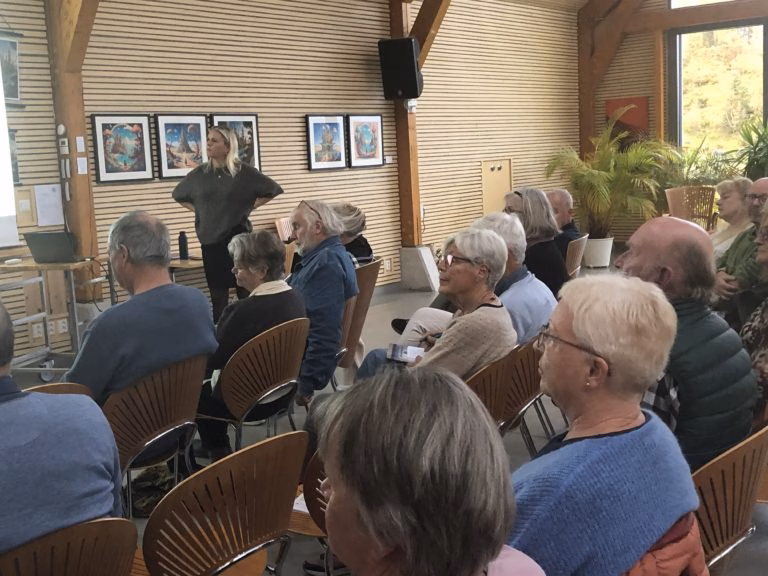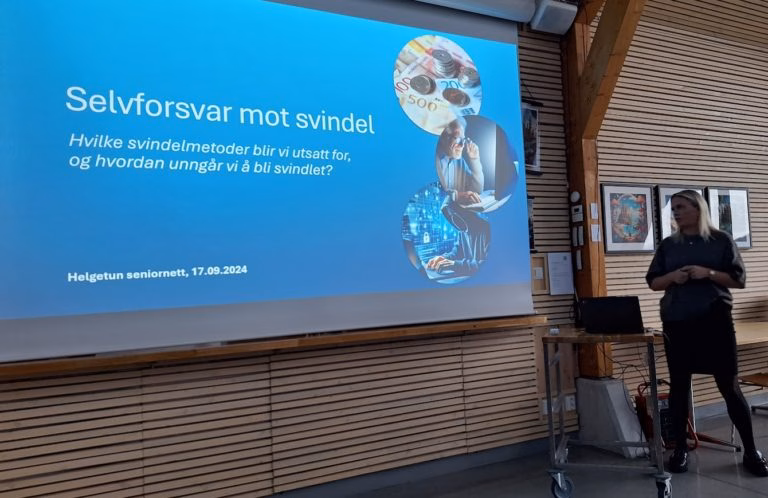 Kine Klokkersund fra Balder betaling hadde et interessant foredrag om hvor lett vi kan bli svindlet på nett hvis vi ikke er oppmerksomme nok. Hun ga mange eksempler på hvordan svindlere opererer og hva vi må passe oss for. Ronny André Øvrebotn fra Vest politidistrikt var med og supplerte henne og oppfordret oss til å være våkne og fortelle hverandre når vi opplever tilløp til svindel. Helgetun seniornett hadde invitert alle interesserte til møtet og det var godt besøkt.