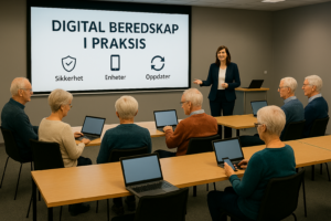 Med temaet «digital beredskap i praksis» tar vi for oss temaer som Bank ID, oppdatering av enheten, lås på enheten, sporing av enheten, passordstrategi, to-trinns pålogging, sikkerhetskopiering, osv, på en konkret og praktisk måte.