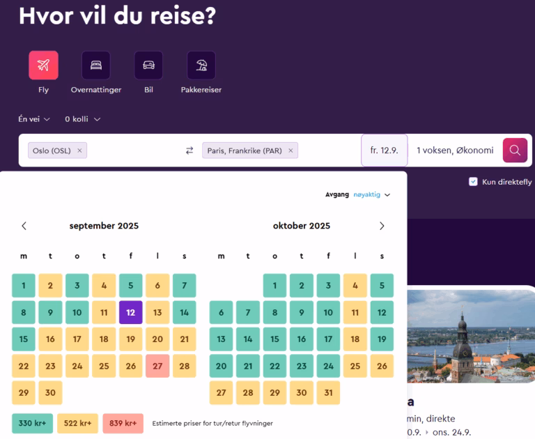 Som du ser kan nettstedet også finne overnatting, leiebil og pakkereiser, men det hopper vi over her.