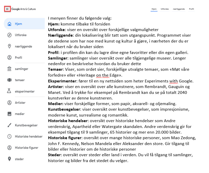 For å finne fram til et bestemt museum, et bestemt kunstverk, en historisk figur eller begivenhet, eller en bestemt kunstner, bruker du menyen på venstre siden. Menyen får du fram ved å trykke på de 3 liggende streker øverst til venstre.