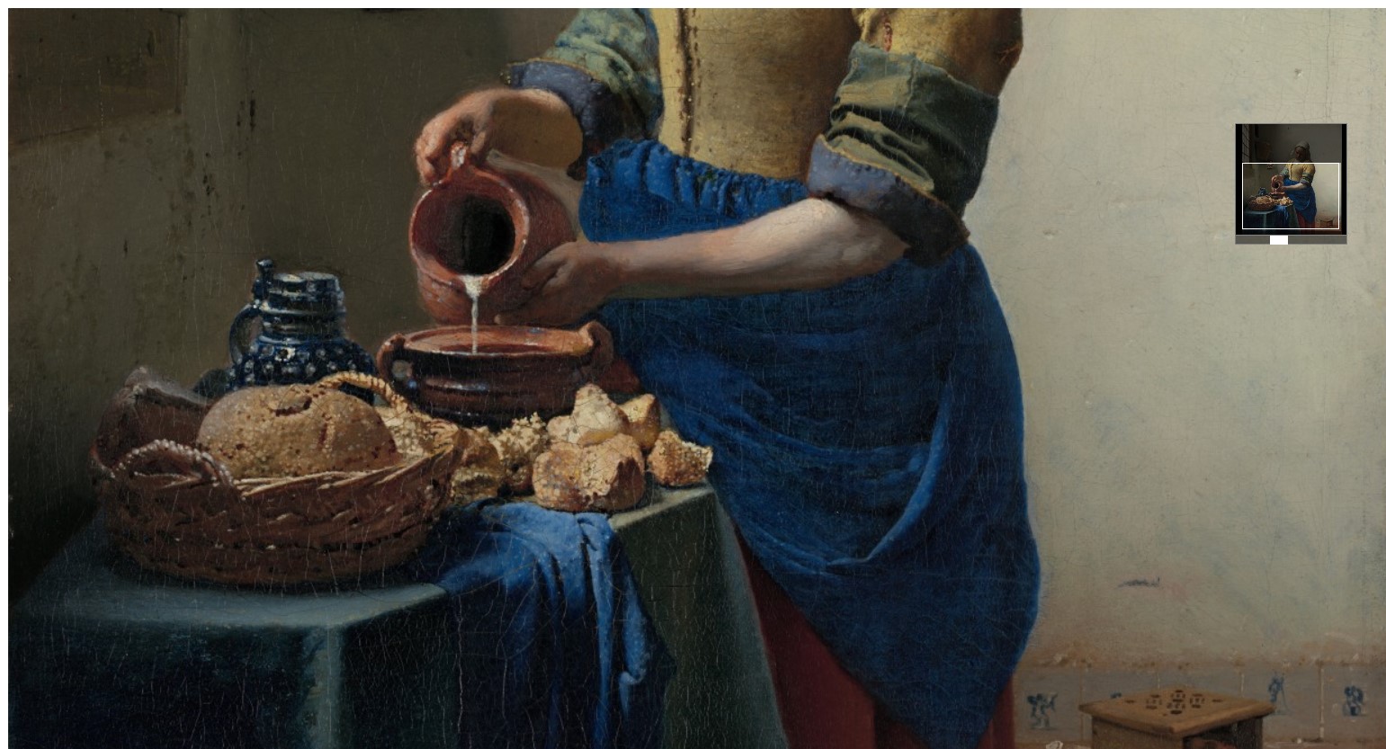 Du kan navigere i maleriet ved å klikke på maleriet, hold ve-museknappen nede og flytte med musen over maleriet. I et lite vindu til høyre kan du se hvor du er på maleriet.