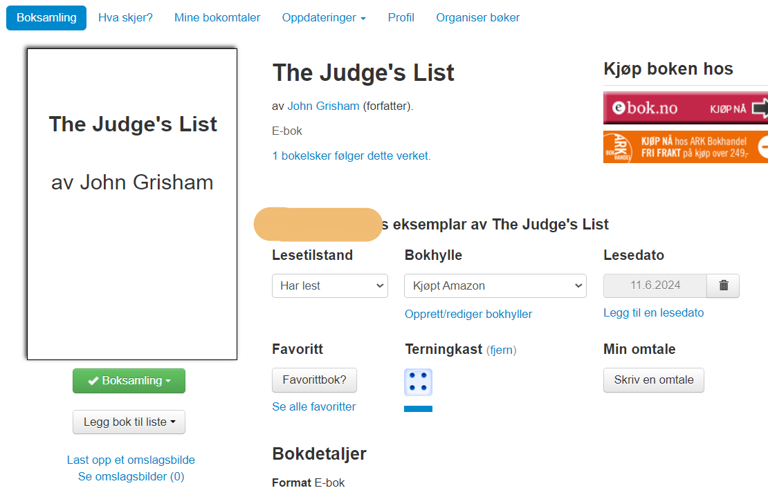 Detaljerte opplysninger om boka jeg nettopp har lest