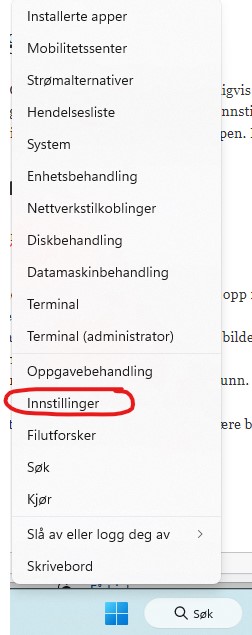 (Finner du ikke “Innstillinger”? Høyreklikk på start-knappen. Der ser du Innstillinger som et valg.)