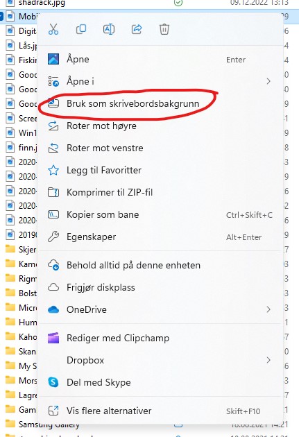 Finn bildet ditt i filutforsker. Høyreklikk på bildet og velg “Bruk som skrivebordsbakgrunn”: