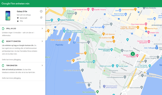 Nå du har gått inn på nettstedet ,vil du se et kart der du ser hvor mobilen befinner seg, og du har noen valg for hva du vil gjøre.