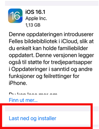 Det søkes nå etter en oppdatering som er tilgjengelig. Om det ikke finnes en ny oppdatering som er tilgjengelig, vises følgende beskjed «iPadOS er oppdatert» eller «iPhoneOS er oppdatert» samtidig som det vises navn på siste oppdatering for eksempel iPadOS 16.1.1.Om det er en oppdatering er tilgjengelig vil du kunne velge «Last ned og installer»