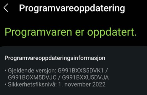 For Samsung-enheter må du trykke på «Last ned og installer». Om det er en oppdatering som er tilgjengelig vil den nå vises, og vil lastes ned og installeres. Om det ikke er en oppdatering tilgjengelig, vil det stå «Programvaren (eller systemet) er oppdatert»