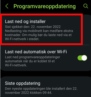 For Samsung-enheter må du trykke på «Last ned og installer». Om det er en oppdatering som er tilgjengelig vil den nå vises, og vil lastes ned og installeres. Om det ikke er en oppdatering tilgjengelig, vil det stå «Programvaren (eller systemet) er oppdatert»