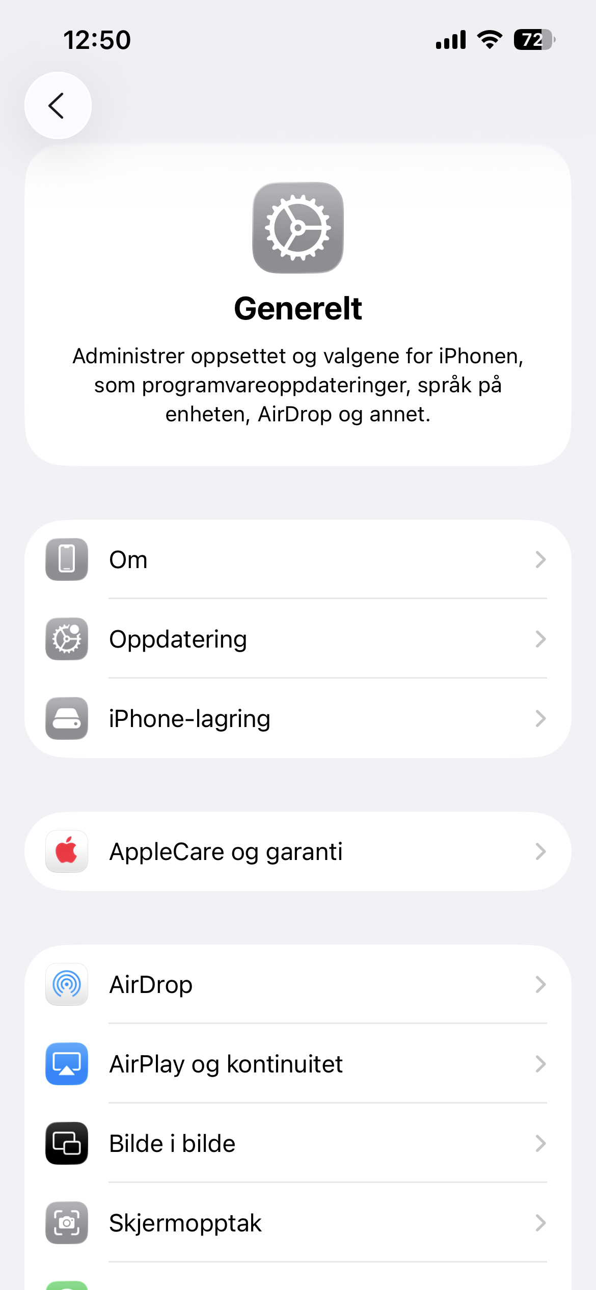Her må du gå inn på “Innstillinger” og velge “Generelt”: