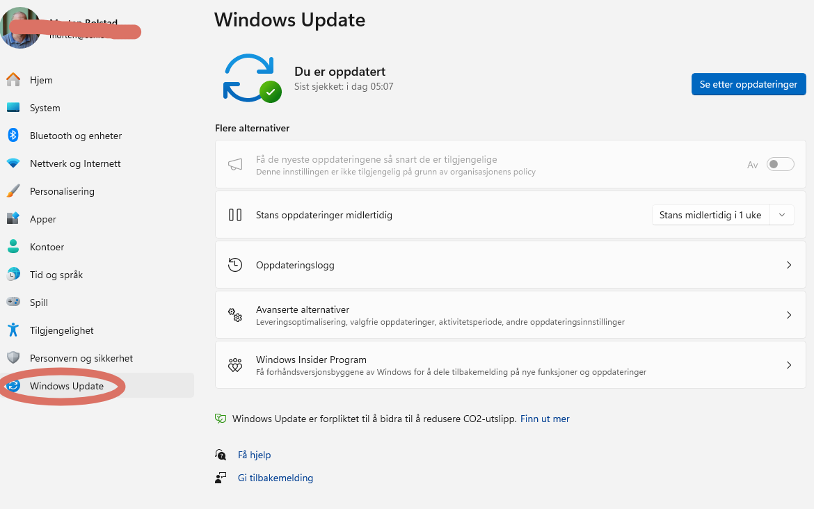 Her ser du at min PC er oppdatert. Da trenger jeg ikke å gjøre noe. Hvis det er oppdateringer som venter vil det stå der og det vil være en knapp som heter “Last ned” eller “Installer”