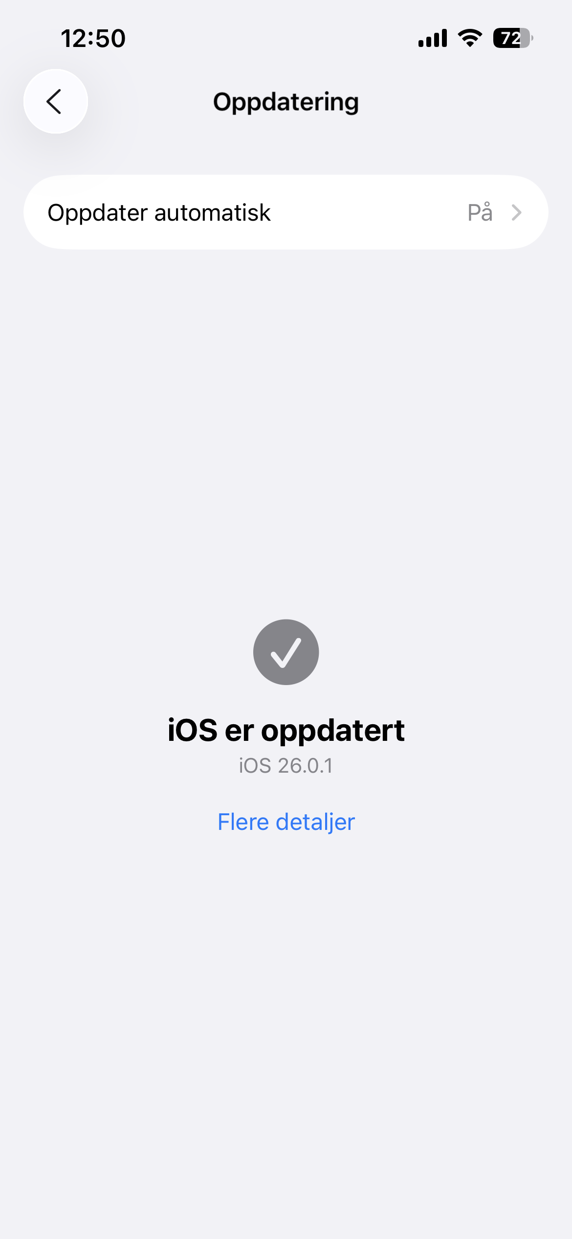 I dette tilfelle må jeg trykke på knappen “Se etter oppdateringer”. De fleste telefoner/nettbrett har et valg som sier “last ned oppdateringer automatisk” eller noe som ligner. Lurt at denne står på.