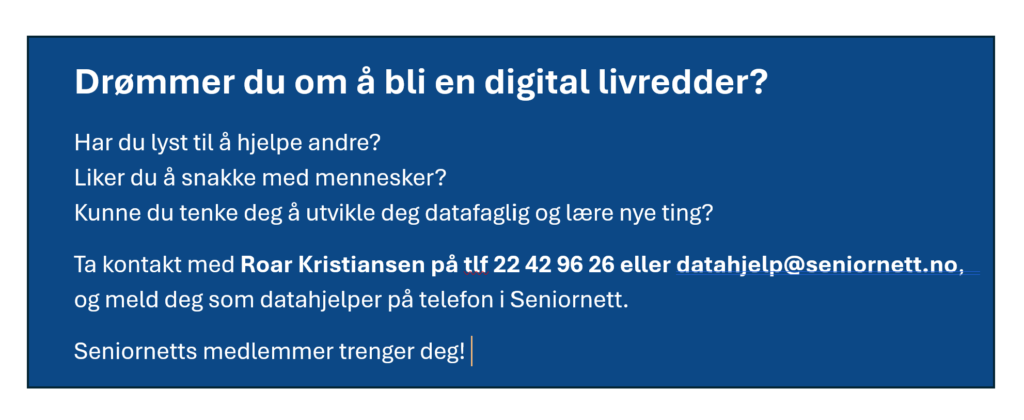 Jeg har blitt kjent med mange hyggelige personligheter og syns det er svært givende å administrere Seniornett Lillehammer. Alle de gode minnene og positive tilbakemeldingene tar jeg med meg videre og gjemmes i hjertet. Det sosiale er viktigst, men det er også motiverende å få brukt hodet. Hver gang noen spør om et problem må du undersøke, kanskje lete litt på nett, prøve Google eller Kunstig intelligens (KI). Det er en flott mulighet til å følge med på utviklingen og en god anledning for å sette seg inn i nye utviklinger og utfordringer.