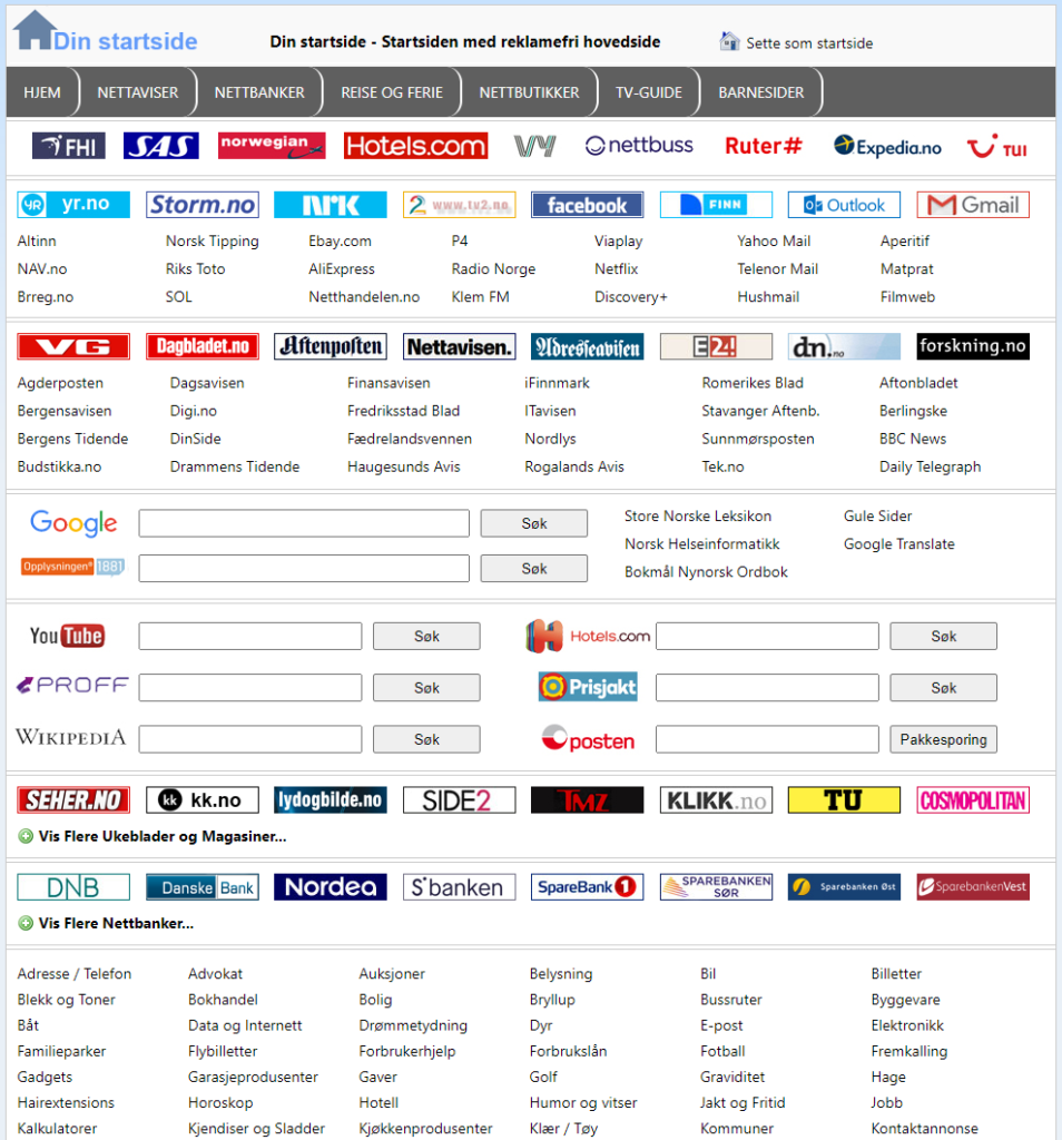 Noen ord til slutt om startsiden.no. Det finnes et alternativ med reklamefri hovedside. Den har adressen dinstartside.no.
