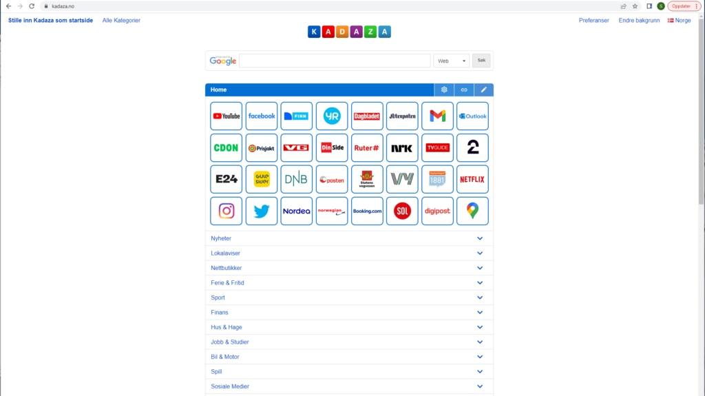 Hvis du vil se på alternativer, bør du sjekke ut kadaza.no. På den finner du en rekke ulike kategorier, med underliggende nettsider (du ser dem hvis du trykker på tegnet på høyre side av emnet). Dermed er siden oversiktlig, uten masse nyhetsbokser og reklame. Spesielt på smarttelefon og nettbrett er enkelhet og oversiktlighet viktig.