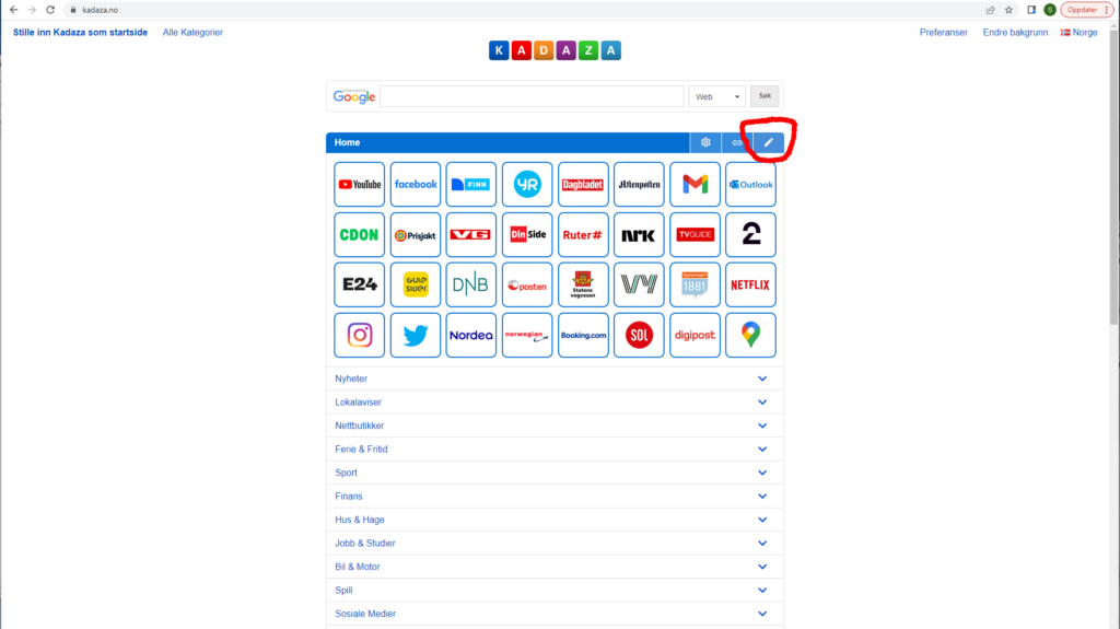 Hvis du vil lage din personlige startside, skreddersy siden, kan du gjøre det i det øverste feltet som heter «Home». Klikk på redigeringsverktøyet, det som ser ut som en blyant.