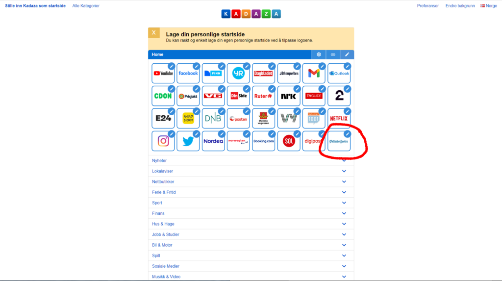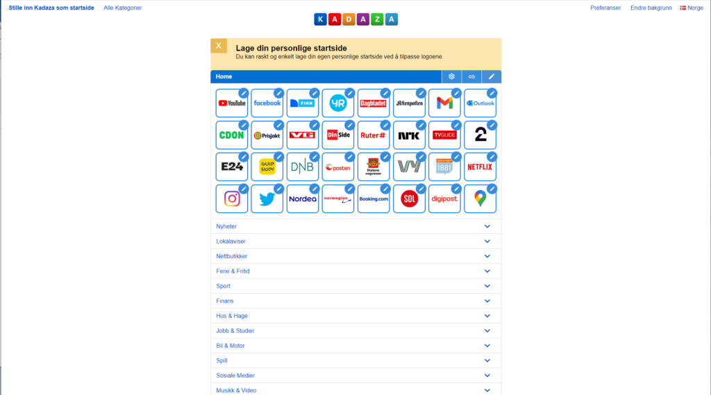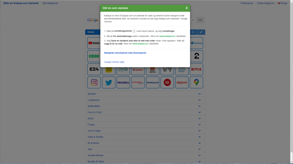Hvis du gjerne vil ha Kadaza som startside, trykker du på «Stille inn Kadaza som startside» øverst til venstre på skjermen. Du får da opp en trinnvis forklaring til hvordan du skal gjøre det.