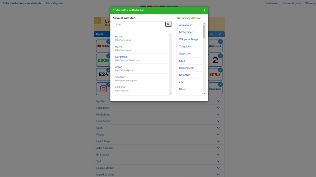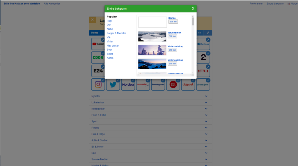 Hvis du synes den hvite bakgrunnen på startsiden er litt kjedelig, trykker du «Endre bakgrunn» oppe til høyre på siden. Da kan du velge mellom en rekke ulike bakgrunner ved å trykke «Still inn».