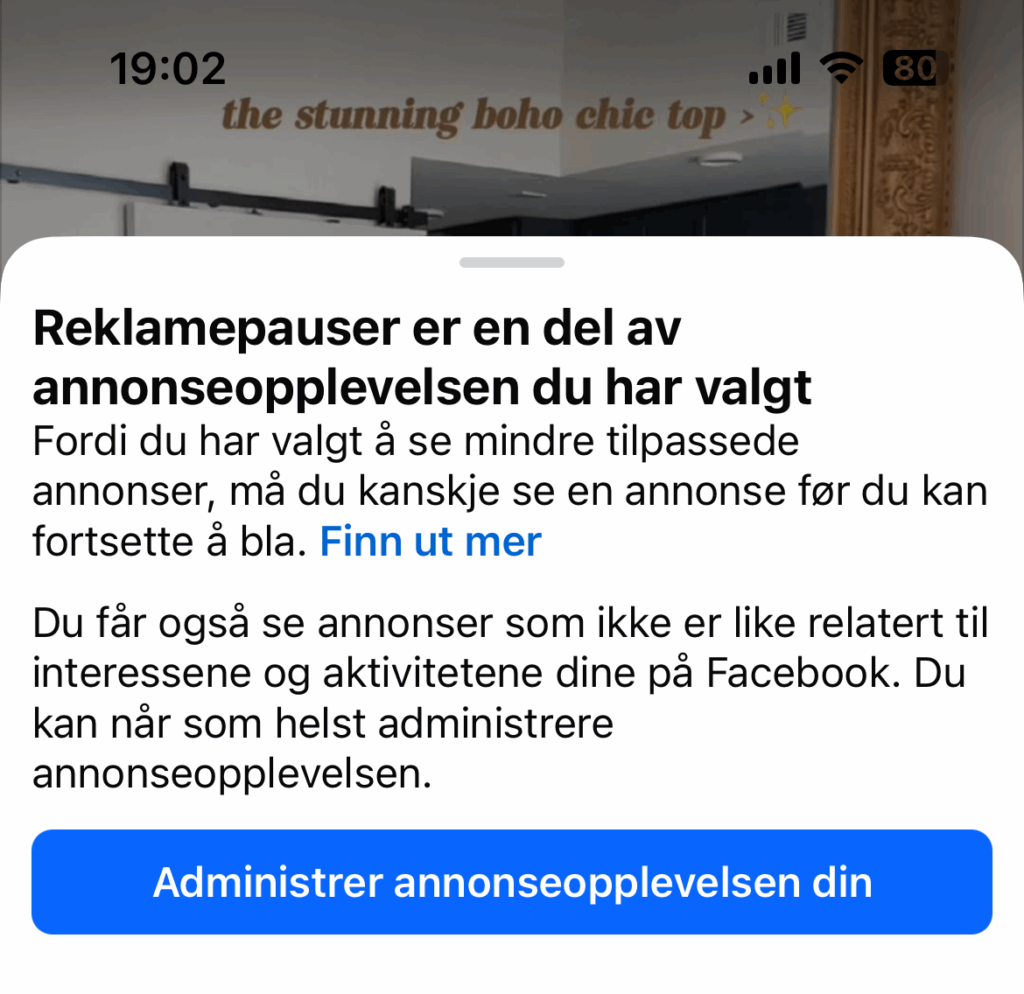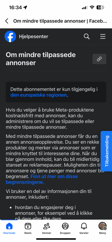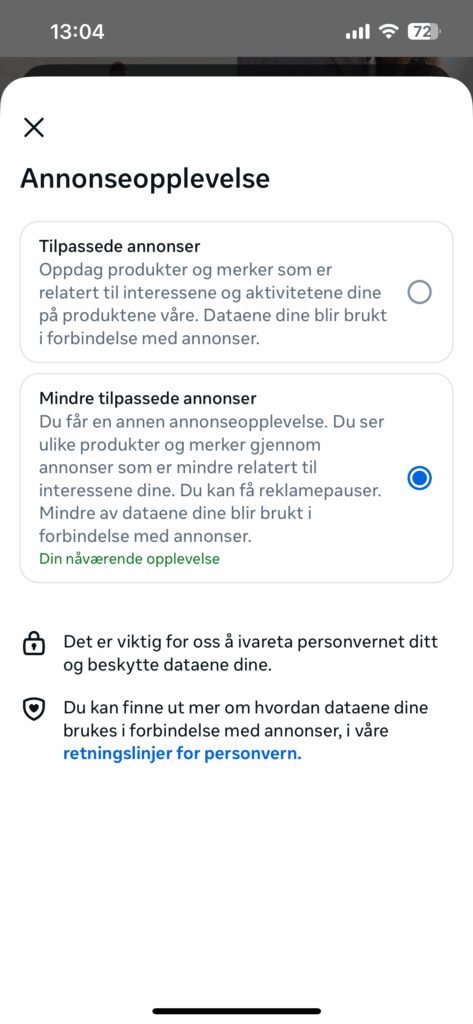I artikkelen blir du loset inn til et menyvalg der du kan justere dette. Alle måtte for litt siden velge mellom å betale for å bruke Facebook og Instagram eller å få annonser, men det ble ikke der opplyst om det tredje alternativet, som er vanskelig å finne, men NRK har skrevet fremgangsmåten i artikkelen over. I det tredje alternativet kan du velge å få mindre tilpassede annonser.