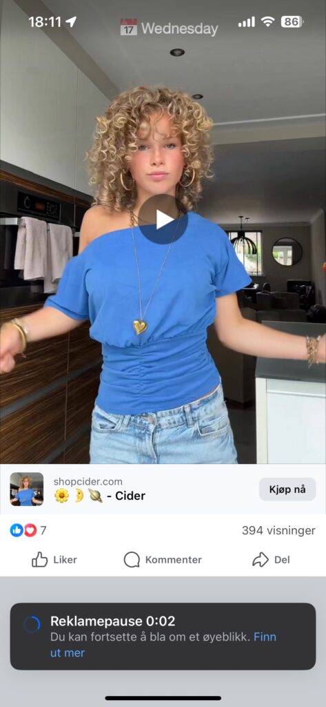 Som du ser i bildet over får du plutselig en pause i skrollingen, med en nedtelling og en reklame som vises. Artikkelforfatter vet ikke hva det reklameres for og han har gjort som NRK viste, satt reklamen til ikke å være tilpasset deg. Etter at nedtellingen har blitt gjort, dukker bildet under opp. Da ser du at du blir tvunget til reklamepauser siden reklamen er mindre tilpasset deg.