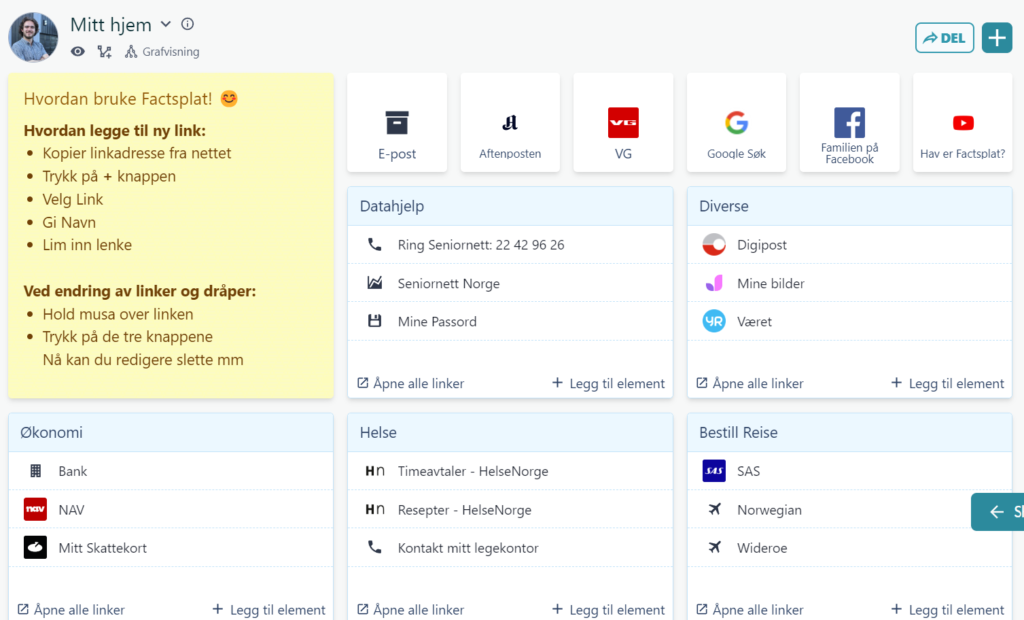 Factsplat er en personlig startside som du kan tilpasse etter dine behov. Her kan du organisere lenker, samlinger og notater slik at du enkelt finner dem igjen og er trygg på at du går til riktig nettadresse. Med Factsplat kan du visuelt organisere notater og bokmerker slik at du raskt finner det du trenger, når du trenger det.