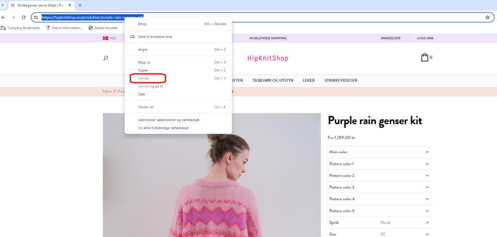 Finn nettstedet du vil ha på din startside. Marker nettadressen slik at den blir blå. Deretter høyreklikker du og velg kopi(er). I eksempelet under kan du se en lenke til en nettside med en genser jeg har lyst til å strikke.