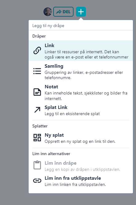 Dråpe: Er en lenke til en nettside, for eksempel VG, Helsenorge eller andre nettsteder, eller en samling av innhold det kan også være notater og bilder.