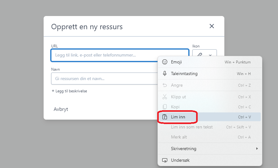 Nå får du opp en boks som er markert “Opprett en ny ressurs”. I feltet URL skal du lime inn nettadressen du nettopp kopierte. Høyreklikk inn i feltet og trykk “lim inn“.