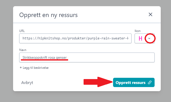 Når du har kopiert lenken fra nettsiden inn i feltet URL vil du se hele den lange nettadressen. I feltet Ikon vil boksen komme med et forslag til ikon, vil du sette et annet ikon enn det som er foreslått kan du bruke den lille nedtrekk-pilen og velge selv. I feltet Navn kan du skrive inn hva dråpen skal hete.