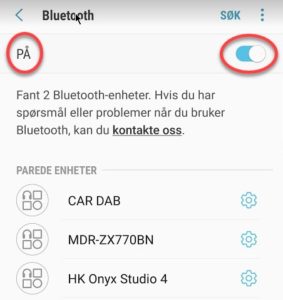 På smarttelefonen, nettbrett og PC ser du en liste over allerede koblede (parede) enheter. Det betyr enheter du har koblet til tidligere som smarttelefonen din husker. I den røde ringen kan du se hvilke bluetooth-enheter smarttelefonen husker og om de er koblet sammen.