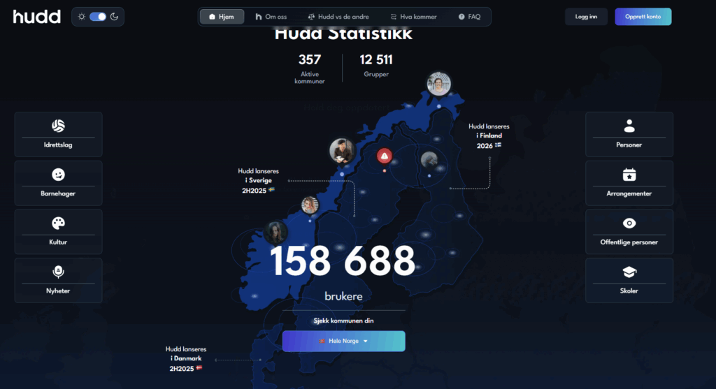 Hudd har foreløpig bare vært tilgjengelig i Norge, men nå har de begynt å operere i Danmark også. Det er omtrent 5000 dansker som har laget seg konto. Sverige og Finland er neste trinn på raketten. I skjermbildet under ser du at Hudd har tett innpå 160 000 brukere.