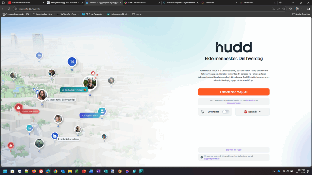 - Vipps-verifisering: For å registrere deg på Hudd, må du logge inn og bekrefte identiteten din med Vipps eller BankID.