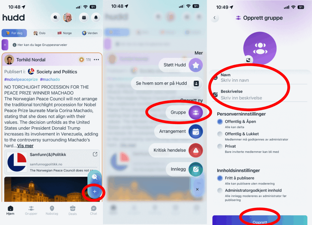I bildet under skal vi se hvordan du kan opprette en gruppe. Du starter med å trykke på plusstegnet nederst til høyre og velger gruppe, skriv inn navnet på gruppen og en kort beskrivelse. Deretter velger du personvern og innholdsinnstillinger, trykk til slutt opprett og gruppen din er klar til bruk. Plusstegnet bruker du også om du skal lage et arrangement eller skrive et innlegg. Innlegg legges på profilen din og blir synlige for dem du velger når du oppretter innlegget.