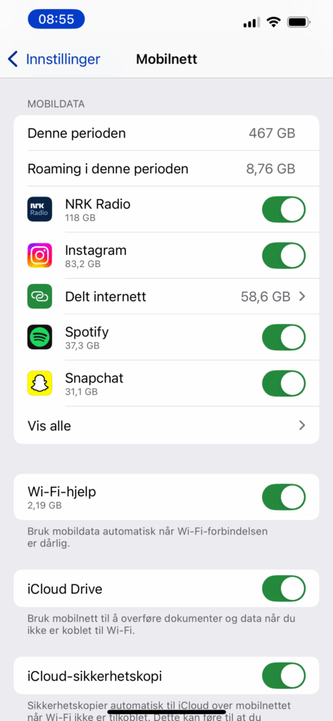 • Mobildata: Datamengden du bruker via mobilnettet når du ikke er koblet til wi-fi.