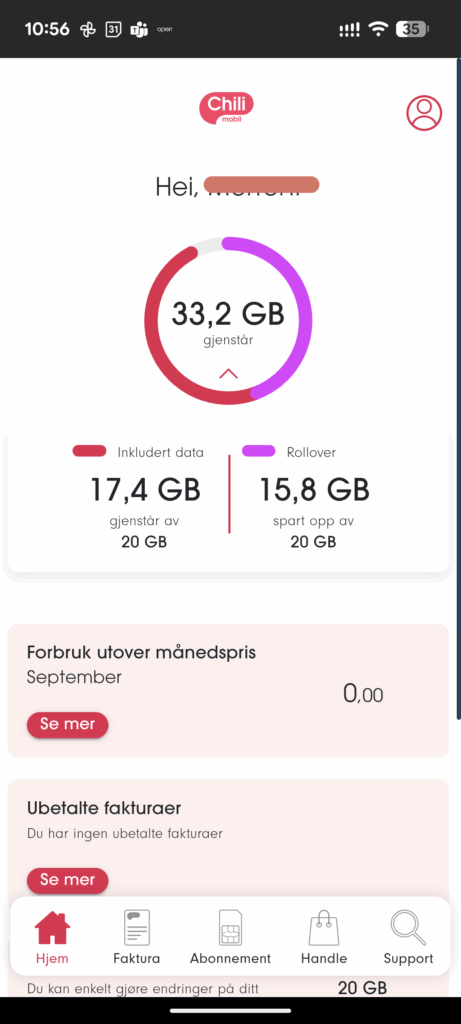 I dette eksempelet, fra MinChili-appen, kan du se at det fortsatt gjenstår 33,2 GB i mobildata-pakken.