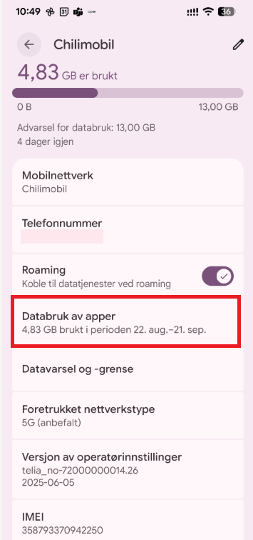 Hvis du vil sjekke hvor mye mobildata du har igjen inkludert i mobilabonnementet ditt må du sjekke i appen tilhørende din mobiloperatør.