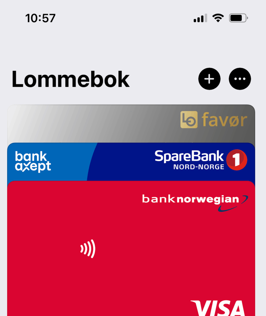 Flere kort i “Lommebok”-appen. Trykk på et av dem for å velge betalingskort.