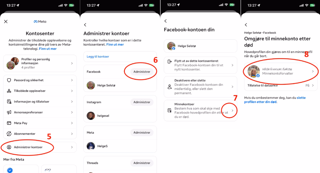 Vi vil anbefale at du oppretter en minnekontoforvalter, da blir dine ønsker oppfylt og du følger anbefalingene og reglene til Facebook. Hvis du trenger hjelp til dette kan du ringe oss på datahjelpen alle hverdager mellom 0900 og 1530, på telefon 22 42 96 26 velg 1 for datahjelp.