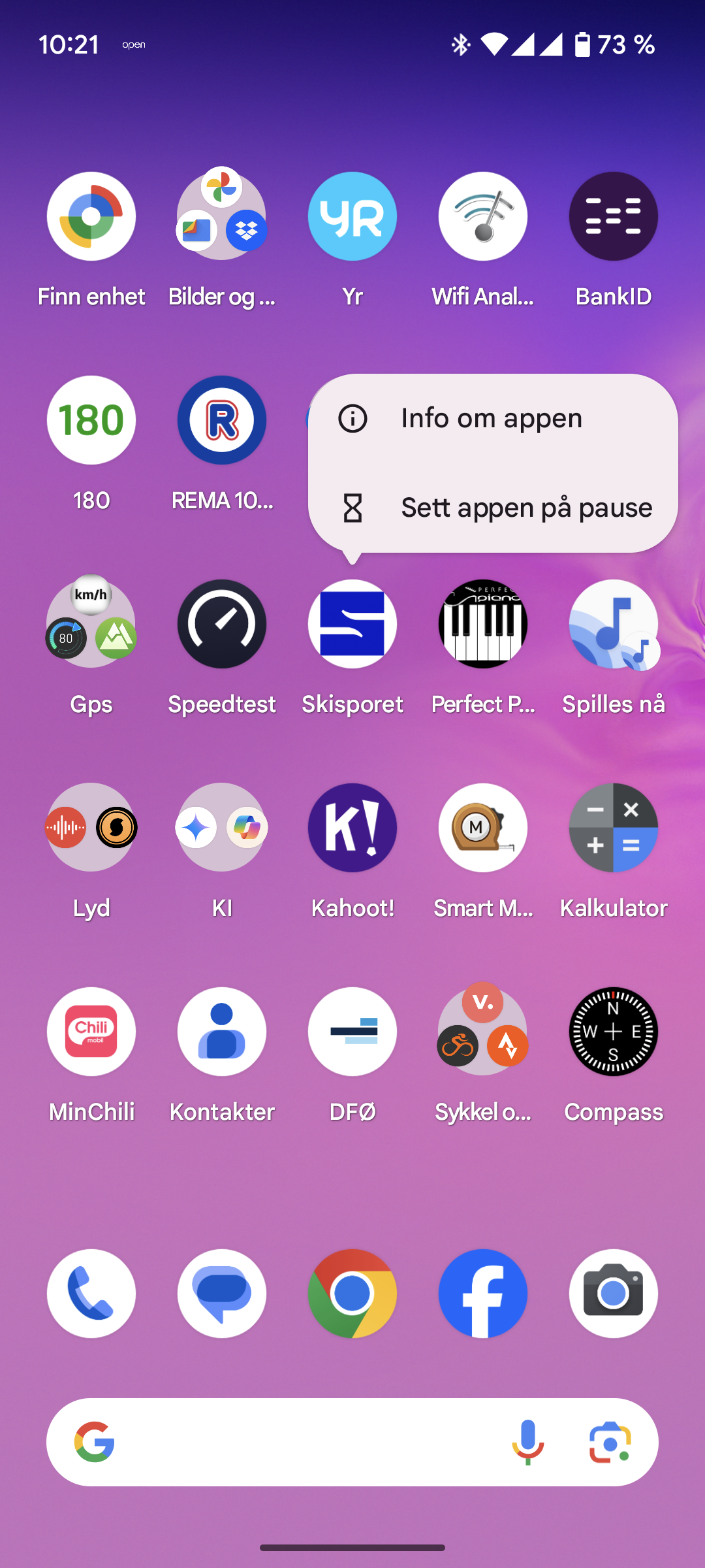 På andre android-telefoner (typisk Huawey, Sony, Motorola) ser det kanskje litt annerledes ut, men også der gjelder prinsippet om “trykk og hold” for å få opp en meny der du kan avinstallere appen.