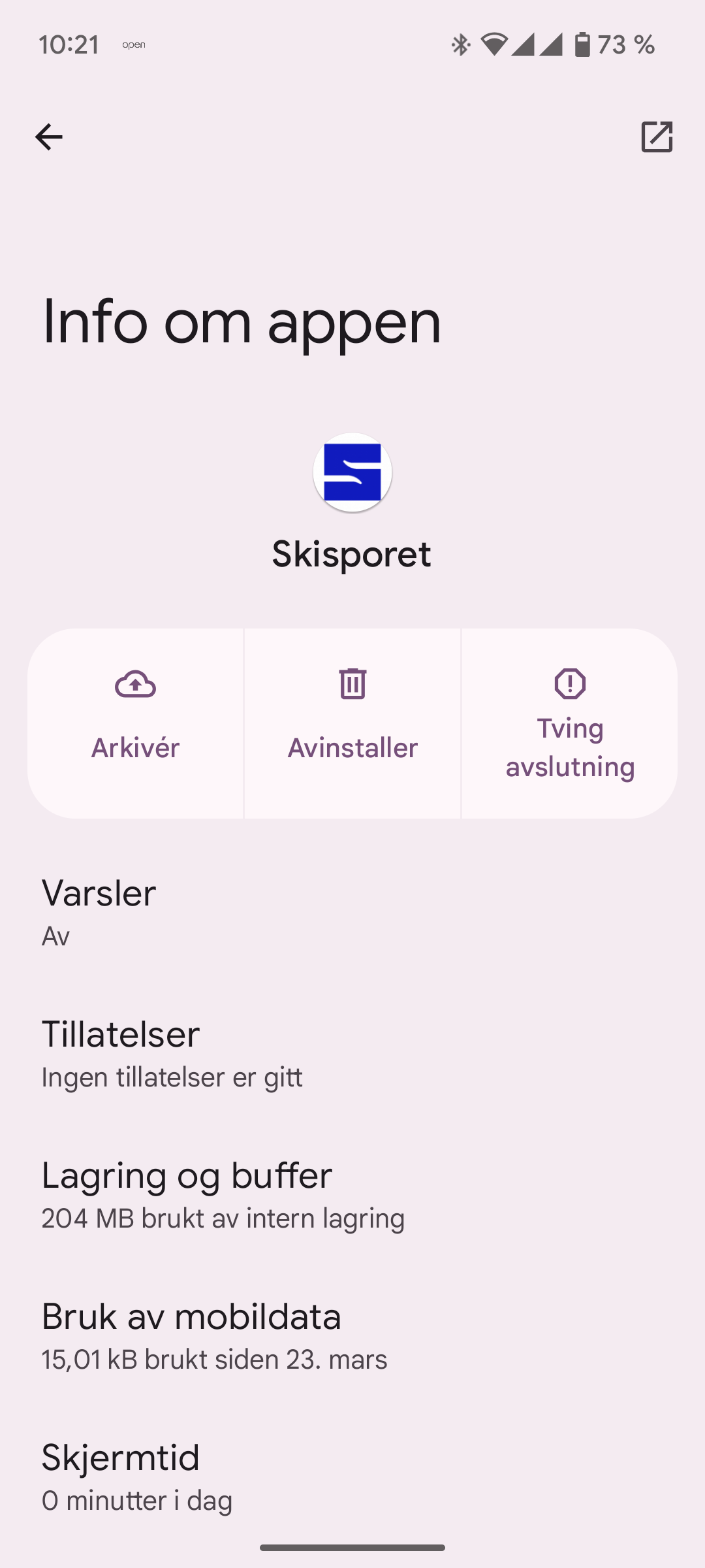 På denne telefonen må vi gå 2 steg. Først trykke og holde og velge Info om appen. Da kommer et nytt bilde der vi ser at valget “Avinnstaller” kan trykkes: