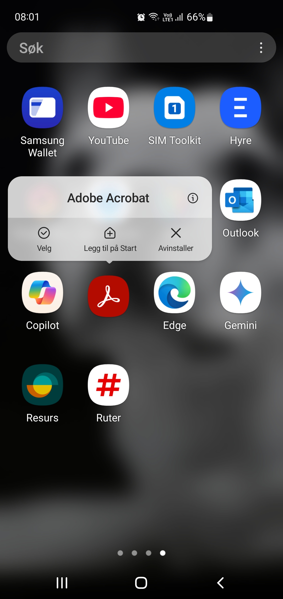 Vi trykker og holder på ikonet for Adobe Acrobat og får opp dette bildet: